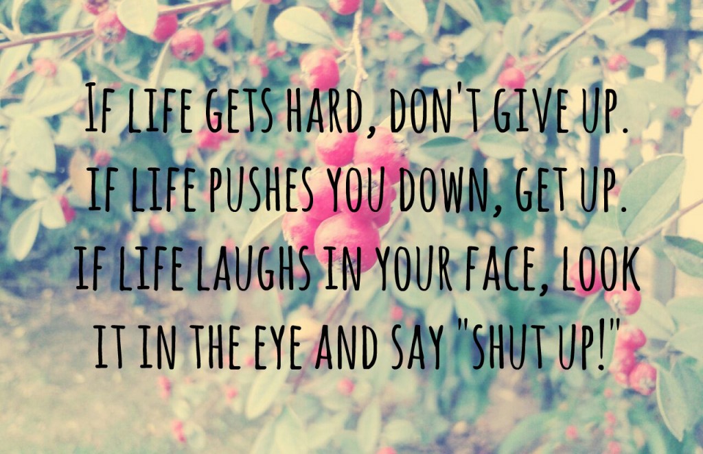 If life gets hard, don’t give up. If life pushes you down, get up. If life laughs in your face, look it in the eye and say “Shut Up”.