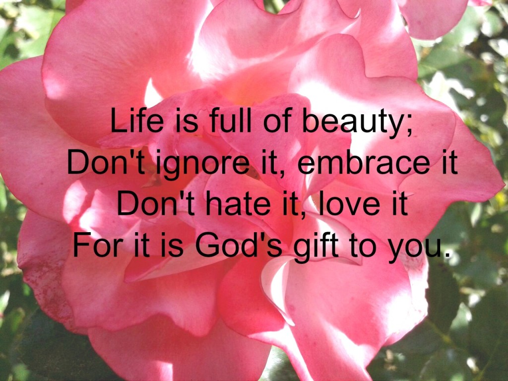 Life is full of beauty; Don’t ignore it, embrace it. Don’t hate it, love it For it is God’s gift to you.